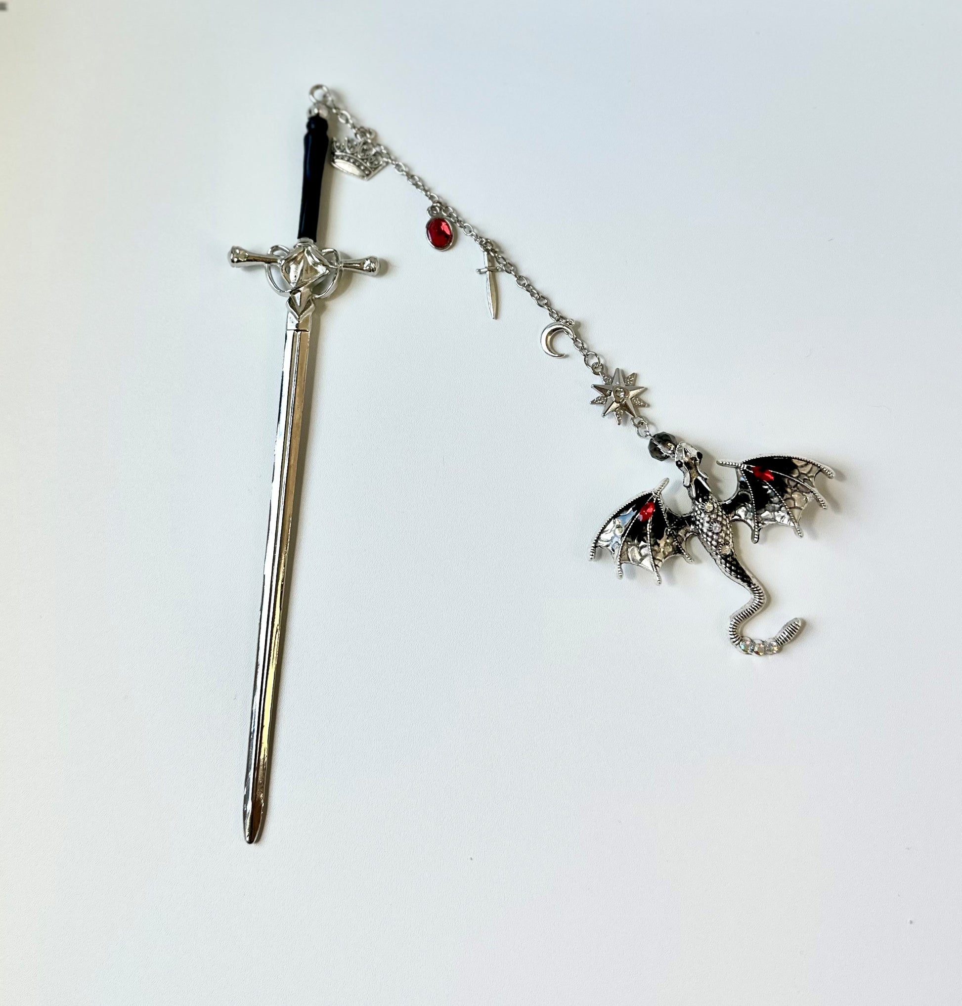 Our large dagger bookmarks are 8-inches long, and the dragon charm is 2.8-inches wide.