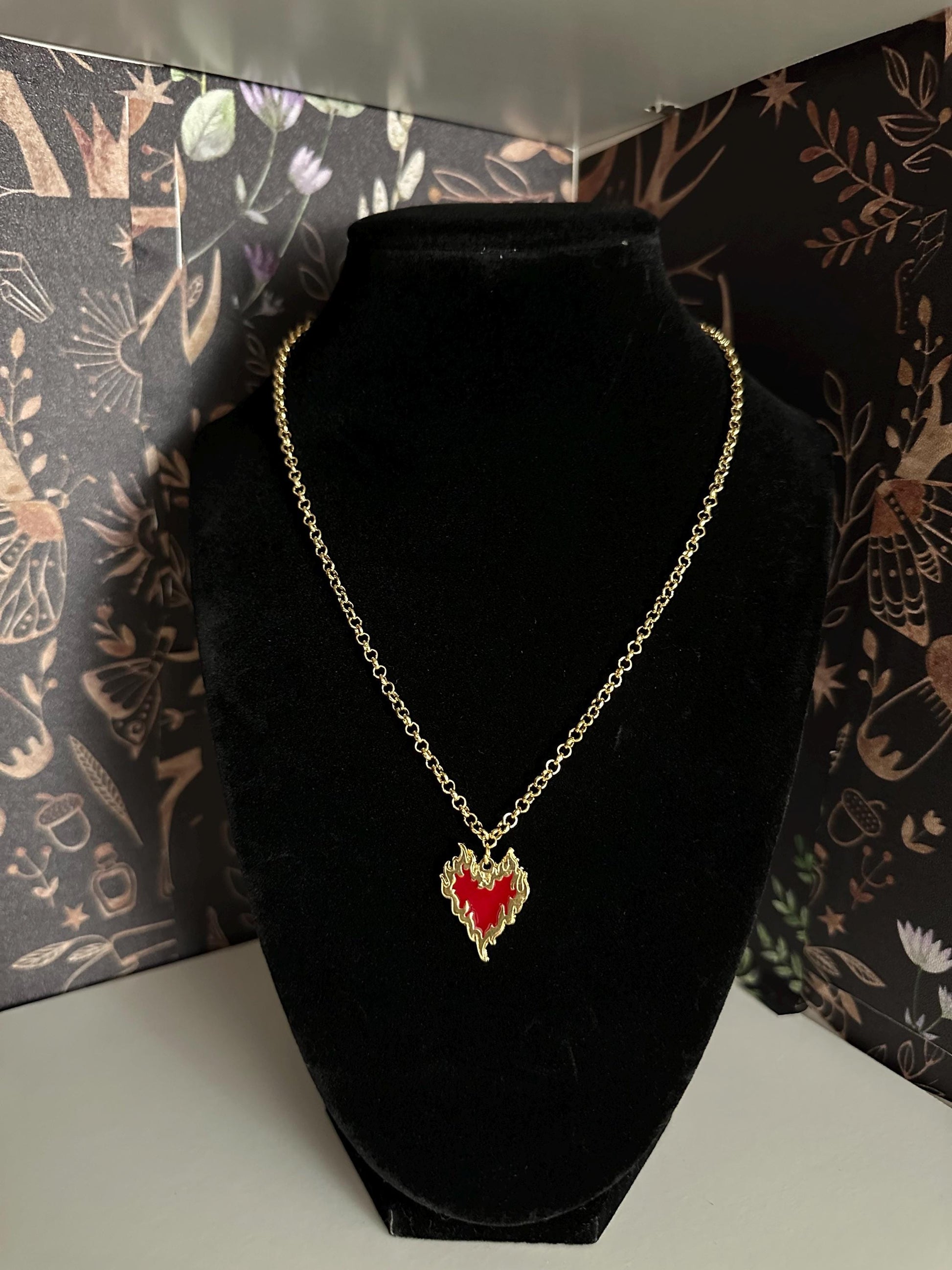 Ignite your inner fire with our Heart Ablaze necklace. Handcrafted with care, this necklace is inspired by the fierce hearts found in fantasy realms. May this piece be a reminder that your fire is never to be tamed.